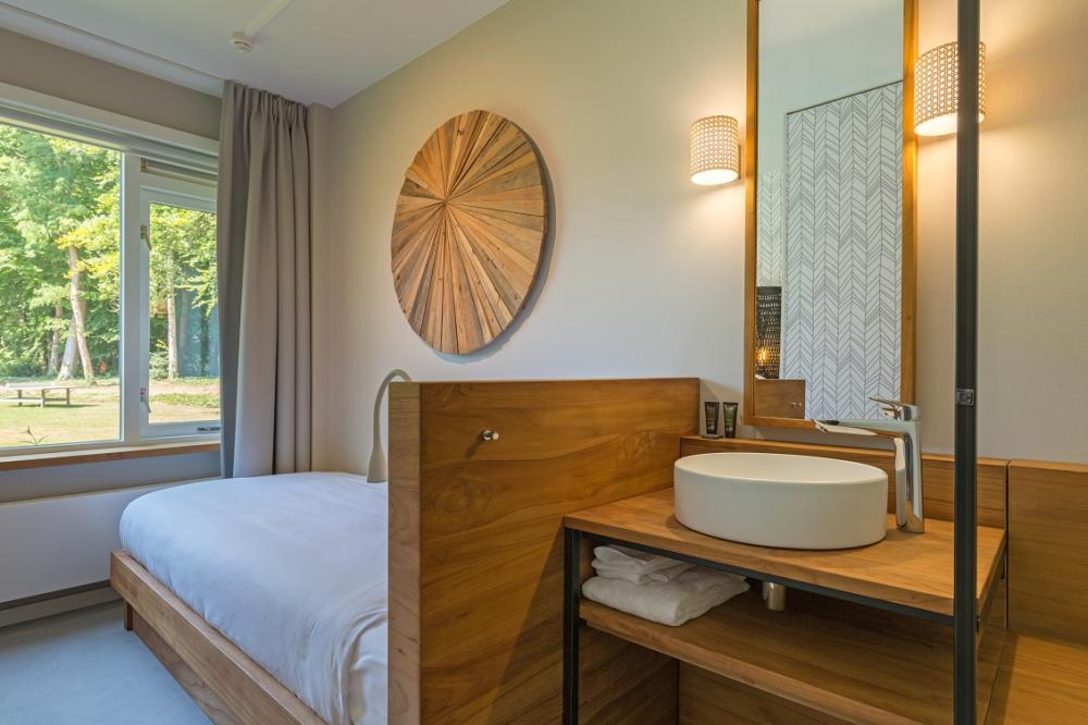 De tweepersoonskamers zijn gerealiseerd in twee losstaande gebouwen genaamd Eb & Vloed. Elke hotelkamer is voorzien van een comfortabel tweepersoonsbed en vertelt een eigen, spannend verhaal met behulp van beeldende kunst, fotografie of muziek. De hotelkamers zijn voorzien van een open badkamer met douche of bad, gratis wifi, televisie, waterkoker en een föhn. De architectuur van deze kamers is gericht op de connectie met het bos. In welke kamer je ook verblijft, je hebt altijd uitzicht op het bos.